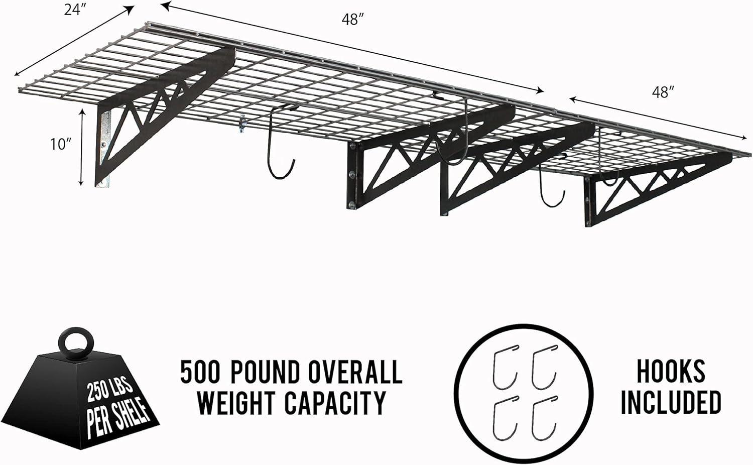 MULTIFUNCTIONAL UTILITY RACK: Each pack includes (2) wall shelves and (4) versatile deck hooks that allow you to use them in many ways. Use them as storage racks and shelving in your basement, garage, pantry, or laundry room, and confidently hang your bicycle, golf accessories, canned goods, or yard tools and more to gain usable floor space.
