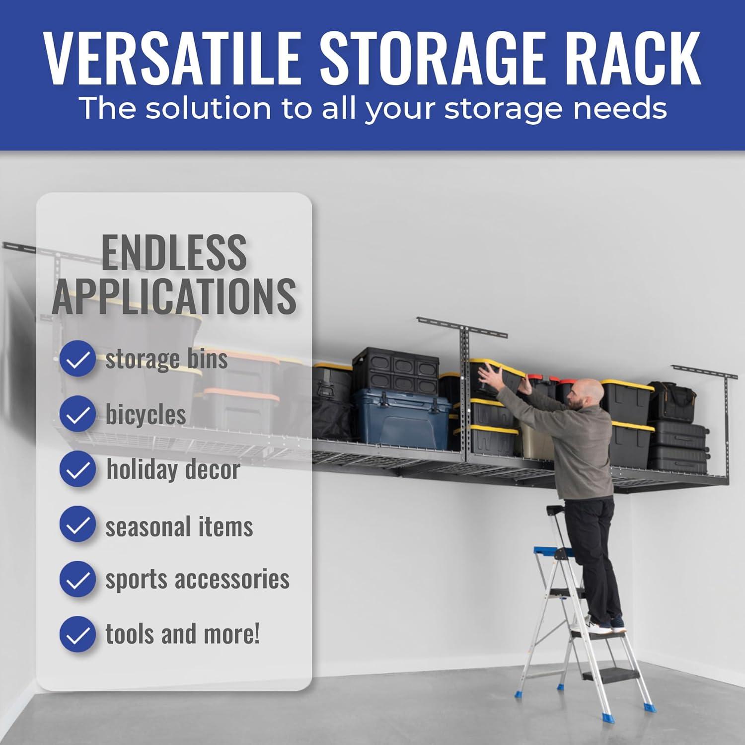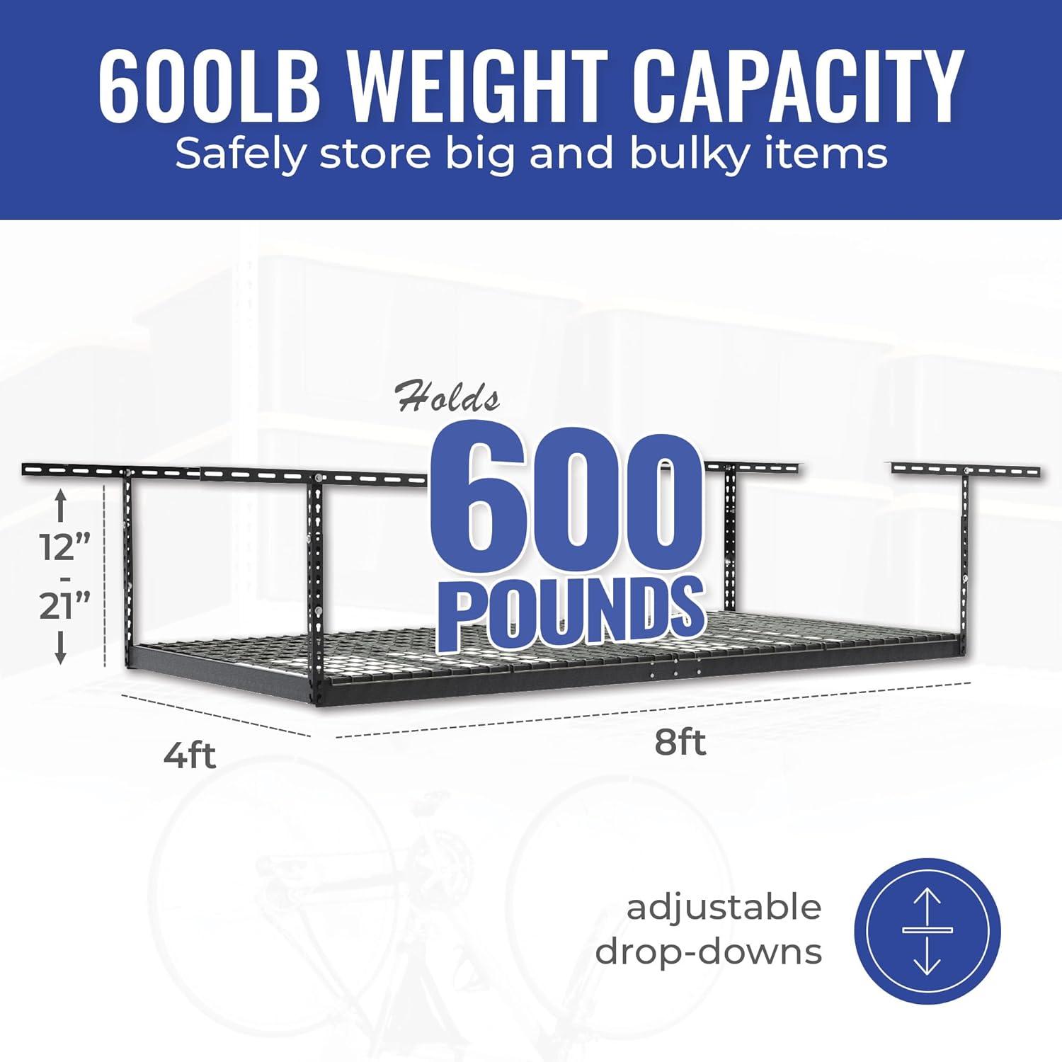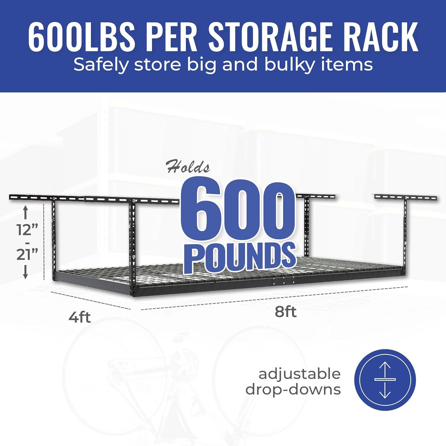 INDUSTRIAL STORAGE RACK: Our industrial rack is a great fit for virtually any garage. It features a full 600 pound weight capacity and adjustable height ranging from 24 to 45 inches from the ceiling. Store storage bins with ease with our hanging storage rack.